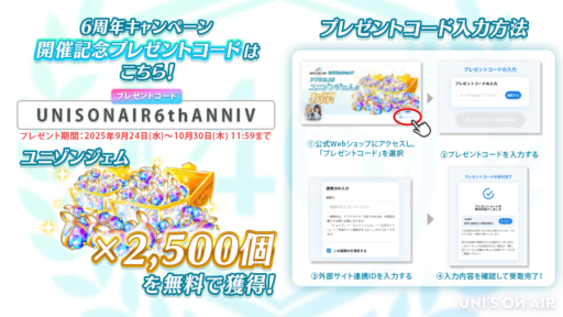 「UNI’S ON AIR 6周年記念特番」で発表されたコードを上記と同じく公式webショップで入力するとユニゾンジェム2500と6周年記念SSR確定チケットをもらえます。