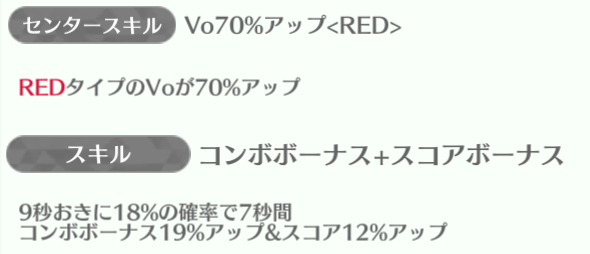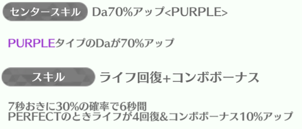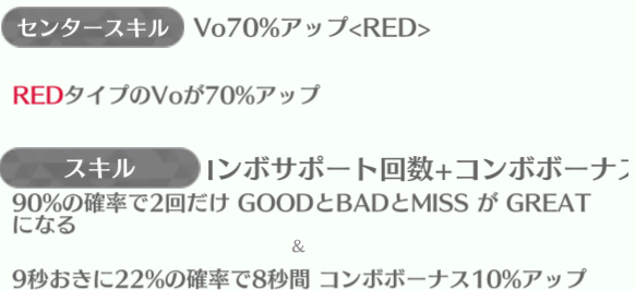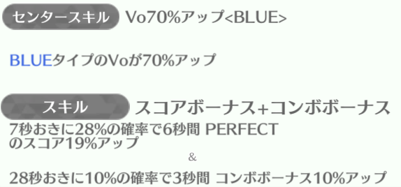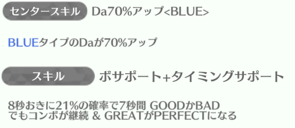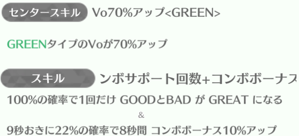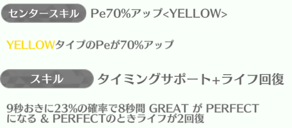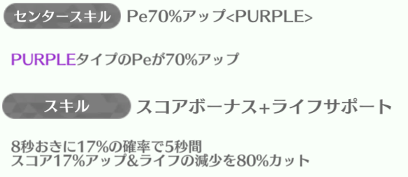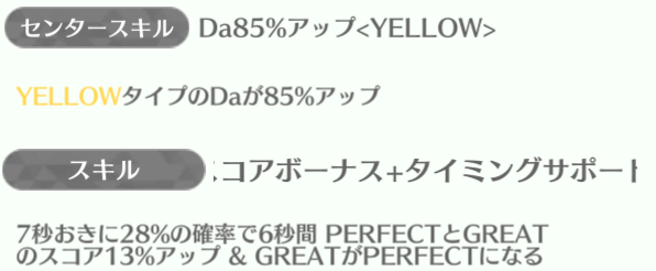 センターの正源司陽子は最強スキルになっていて、平岡海月・山下葉留花が85%アップを持っている。特に山下葉留花はスキルも強いのでしっかり育てていけば長く使える性能。