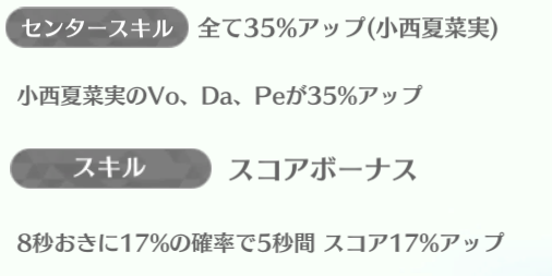 センタースキルは全てそのメンバー限定の全35%アップになっています。スキルも同一で6th ANNIVERSARYでのリニューアル以降はスコアボーナスになりました。ステータスは最大開花できるようになったとはいえ少し控えめになっています。