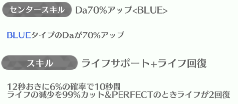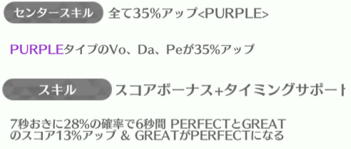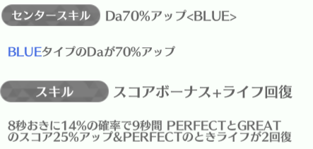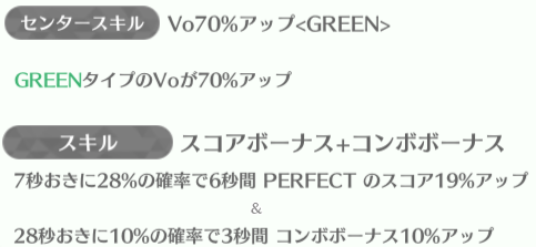 | ID | 名称 | アイコン | スキル期待値 | センタースキル/スキル | Vo | Da | Pe | ライフ | 運 | 備考 |
