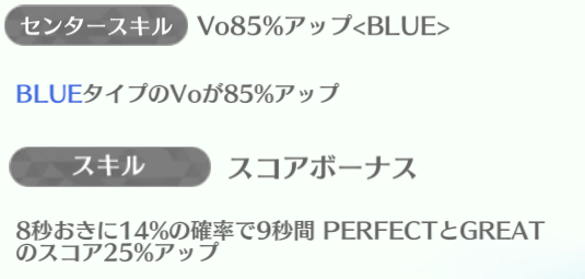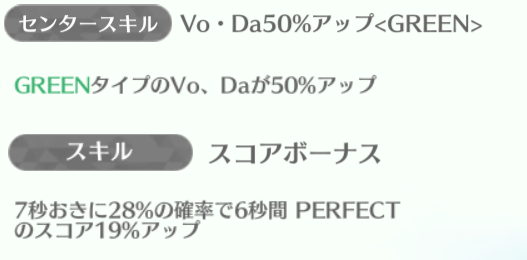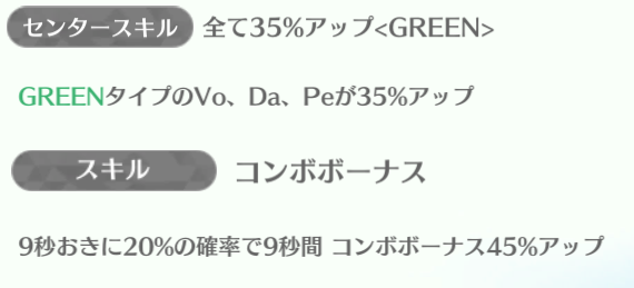 | ID | 名称 | アイコン | スキル期待値 | センタースキル/スキル | Vo | Da | Pe | ライフ | 運 | 備考 |