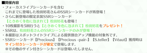 今まで登場した楽曲衣装、期間限定衣装、FLカード、MV衣装カード、バースデーカード、Precious、Precious-pair-、S.teller、Véautが登場します。SSRは全83枚です。さらに10枚撮影5回目で新規期間限定衣装カード『ときめく冬色に包まれて 松田好花』がプレゼントされます。