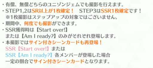 6500ジェムで確実に1枚は新規SSR+解放楽曲衣装が手に入る撮影でおまけで2STEPでフリーDパス×2も付いてきてお得度は高くなっています。人数も8人なので欲しいメンバーも狙いやすいでしょう。センタースキルやスキルも強そうなメンバーも多そうなのでオススメと言えるでしょう。