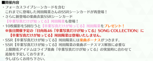 河田陽菜の卒業対応前の最後の撮影です。今までに登場したコラボ以外のシーンカードが入っています。そして10枚撮影5回目で必ず新規楽曲衣装『卒業写真だけが知ってる』の河田陽菜が手に入ります。