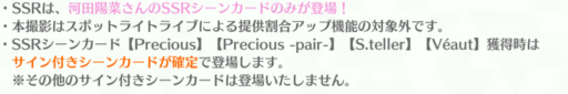 今まで登場した楽曲衣装、期間限定衣装、FLカード、MV衣装カード、バースデーカード、Precious、Precious-pair-、S.teller、Véautが登場します。SSRは全83枚です。さらに先行して楽曲衣装『卒業写真だけが知ってる』も登場します。