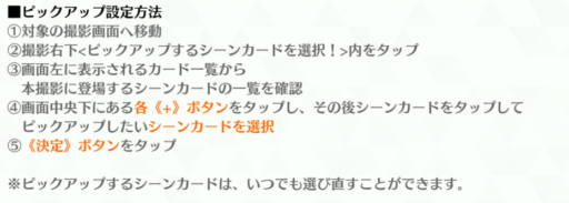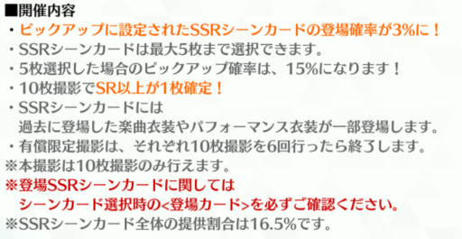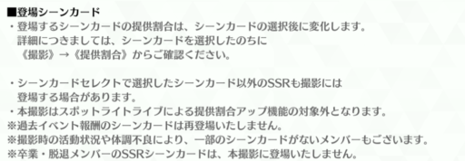 有償限定だがシーンカードとメンバーを選んでピックアップにできる撮影。推しのカードや欲しいカードを狙って回収できる。特に卒業を控えている河田陽菜のシーンカードを狙って回収できるのは最後の機会かも・・・?