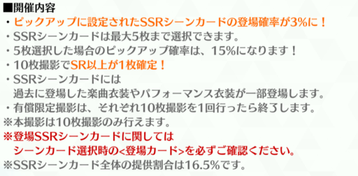有償限定で欲しい衣装とメンバーを選んで確率を上げて引ける撮影。どうやら毎月定期開催するような文言になっています。