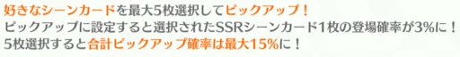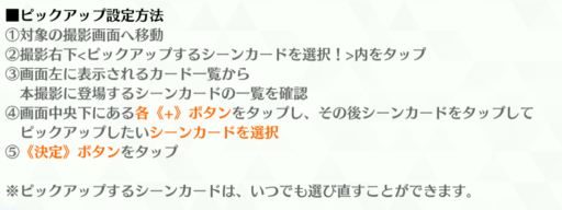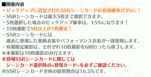 有償限定で欲しい衣装とメンバーを選んで確率を上げて引ける撮影。欲しいカードがあるなら高確率で手に入れることができるので、その場合は撮影してもいいでしょう。まだSSR+化が解放されていない衣装は解放時の3STEP撮影が開催される可能性もあり、そちらで手に入れるという選択肢もあるのでよく考えたうえで撮影に挑みましょう。