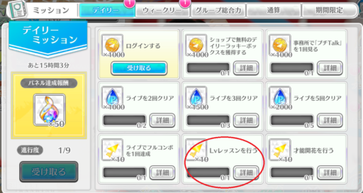 なお、はじめたばかりの場合、8の「スポットライトライブを1回クリア」が「Lvレッスンを行う」に変わっています。