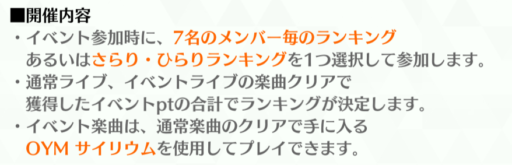 基本的には通常楽曲をプレイしてイベントアイテムを獲得して、そのアイテムを使用してイベント楽曲をプレイしてptを積み上げていくイベント。