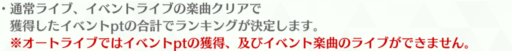 イベント楽曲は通常楽曲やマルチライブで手に入る【サイリウム】 を使うことでプレイできます。難易度や楽曲関係なく1回のプレイでサイリウム50個 を使用して行うことが出来ます。 通常楽曲でもイベントptは獲得できますが、ごく僅かなので、基本的にはイベント楽曲をプレイしてptを獲得していく形となります。 一定のpt毎に報酬が設定されていて獲得したptがそれを超えると都度報酬がもらえます。 最終的な獲得ptによってランキングが決定し報酬が配布されます。 こういったptを獲得してランキングを決めるイベントは何個かありますが、このイベントの一番の違いは同時開催されるFocus Live Collection撮影と連動していることで、イベント楽曲プレイ時にランダムでFocus Live Collection撮影で登場している新規のフォーカスライブが見れることです。 FEVER CHANCEは通常楽曲のプレイでは発生せず、イベント楽曲プレイ時にランダムで発生します。なのでポイントは少し稼ぎづらくなっています。 イベント期間中は通常楽曲のまとめて消費機能が1日5回までになります。イベント楽曲のサイリウムまとめて消費も1日5回までで別カウントになっているので、通常楽曲でも安心して使用しても大丈夫です。 18万ptとランキング2万位以内でFLカードが1枚ずつ報酬に設定されています。