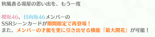 SSRは櫻坂46は【紅葉彩る湯屋の花】、日向坂46は【秋そよぐ癒しの陽光】のみ登場します。