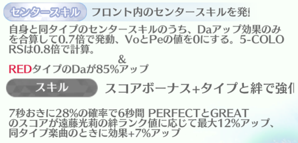 S.tellerの遠藤光莉はDa特化編成で使うのが1番最適だが、自身のVéautも赤なので多少倍率を落としてもVéautの遠藤光莉をセンターにおいて編成すればタイプボーナスもしっかり得たうえでスキル発動率も上げられ、スキルの同タイプ楽曲で上がる倍率分もしっかり発動させられるので、一考の余地はありそう。