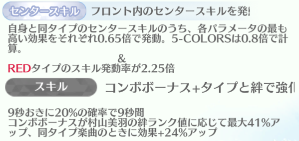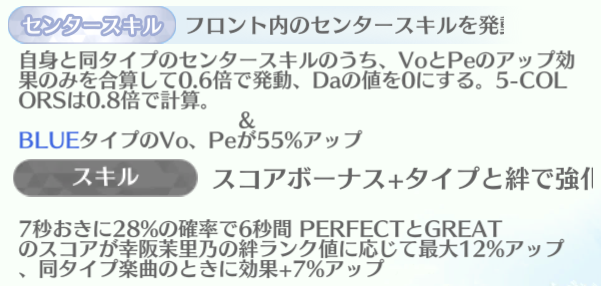 センタースキルが特殊で編成内の他の4枚のカードのセンタースキルを参照して倍率を決定する。うまく編成すれば現環境で最強レベルのセンタースキルとなっている。スキルもそのメンバーの絆ランクにより倍率が上昇していくので、絆ランクを上げていけば通常のカードのスキルよりも高倍率になるのでかなり強いものになっている。