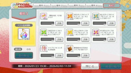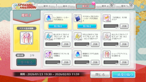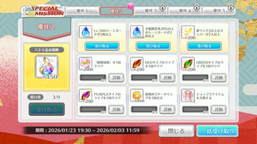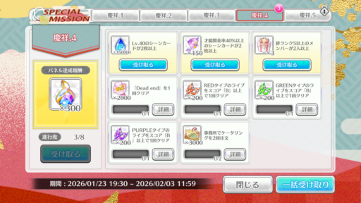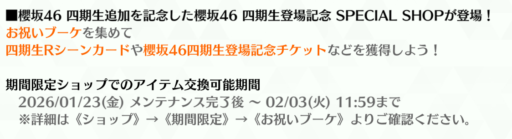 上記のSPECIAL MISSIONをクリアすることで手に入る《お祝いのブーケ》をアイテムと交換できます。ラインナップには新規追加された櫻坂46四期生のRカードや上限開花キーもあるので必ず交換しておきましょう。