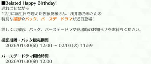 12月に誕生日だった2人のバースデー撮影などを遡って開催するようです。これはありがたいですが、今までこんなことはなかったような気がします。また来年の7周年にはリニューアルしてしまうのでせっかく撮影してあるものが日の目を見ないのは偲びないというところかもしれません。