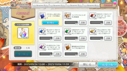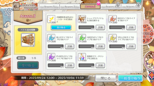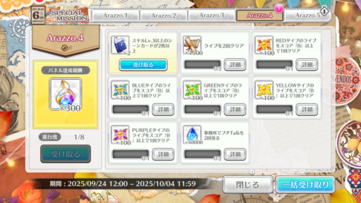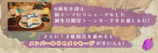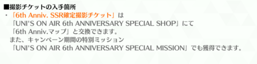 【何歳の頃に戻りたいのか?】【君はハニーデュー】までの楽曲衣装全部入りです。チケットは6th ANNIVERSARY SPECIAL SHOPで2枚、特別ミッションのArazzo.3(28日~)で1枚の計3枚もらえるようです。チケット1枚で10枚撮影1枚以上SSR確定なので最低でも計3枚はSSRが手に入ります(すでに持ってる物が出てしまった場合は上限開花キー)。その後のMap.2~3でも追加でもらえました。