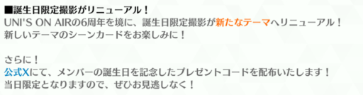 各撮影初回10枚撮影無料です。SSR【UNI’S ON AIR 6th ANNIVERSARY】は「6th ANNIVERSARY Member Yell Ranking」の特効カードになっています。また、スポットライトボーナスも11/07(金) 03:59までの長期間ついています。